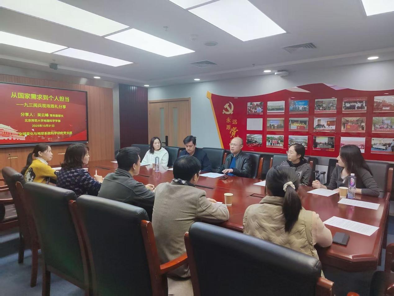 2025年10月31日,全球变化与地球系统科学研究党支部围绕“从国家需求到个人担当”主题,组织开展主题党日活动。活动邀请了亲临天安门广场观看“九三阅兵”——纪念中国人民抗日战争暨世界反法西斯战争胜利80周年阅兵式的学部常务副部长吴云峰老师。吴老师结合现场经历,与支部成员分享了所见所闻、所思所感,为大家带来了一场深刻而震撼的精神洗礼。