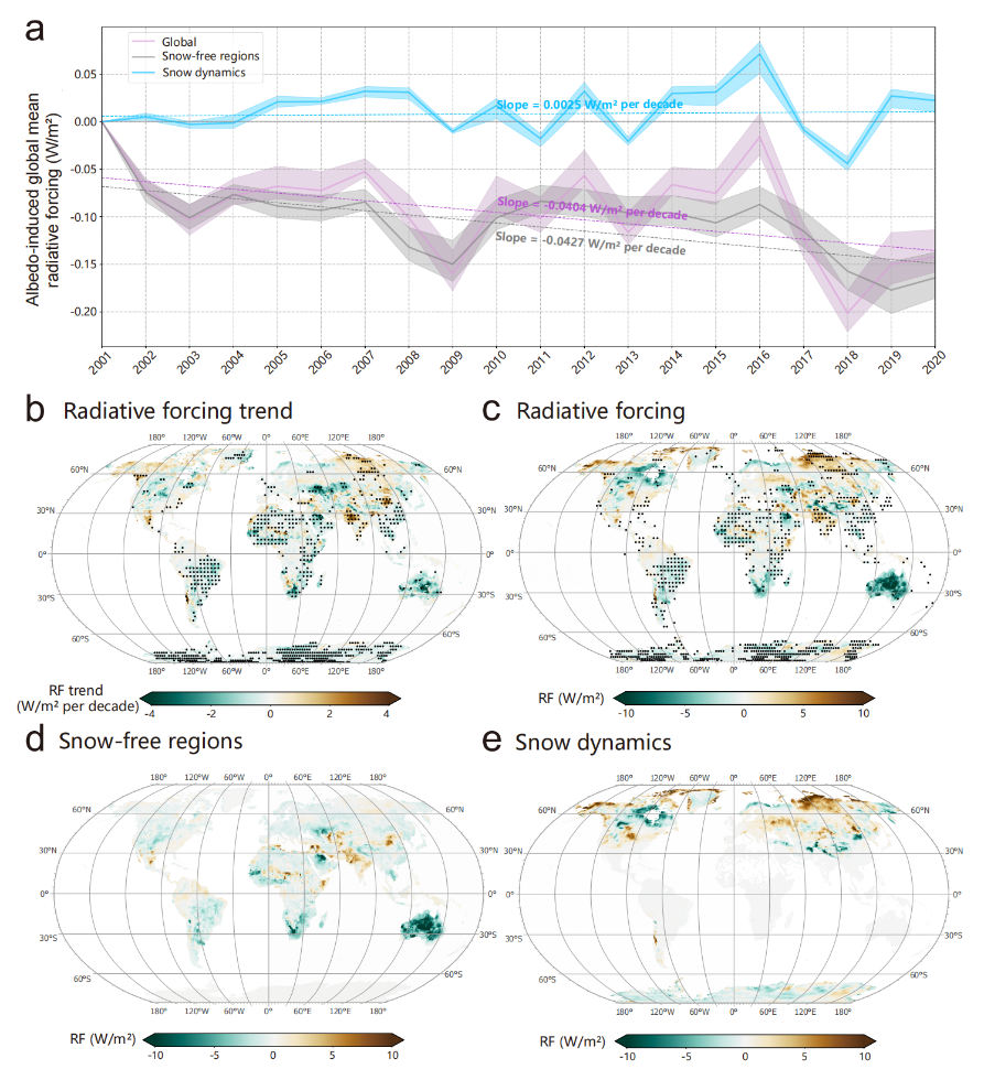 日益频繁的人类活动以及持续加剧的气候变化正深刻改变着全球陆地表面的生物物理特性,进而引发陆表反照率(albedo)的变化。传统观点认为全球陆表反照率的变化及其在调节气温方面的作用非常有限。然而,全球陆地面积广达1.49亿平方公里,即使是微小的反照率变动也会产生不可忽视的辐射强迫,进而对全球温度变化产生重要的影响。因此,厘清全球陆表反照率的变化规律和驱动机制,对于科学应对气候变化,制定合理的全球气候变化应对策略具有重要的意义。然而,过去几十年来全球陆表反照率的变化趋势及其产生的辐射强迫效应仍未得到充分理解,目前仍然缺乏在全球尺度上的关于土地利用/土地覆盖(LULC)变化、冰雪融化、植被变化等因素对陆表反照率影响的系统评估。张立强教授团队和国外内科研机构合作,量化了2001-2020年间全球冰雪变化、LULC变化及未发生LULC变化区域陆表对全球陆表反照率动态的独立贡献,并估算了其产生的辐射强迫。研究成果以“21世纪初陆表反照率升高导致辐射强迫降低”(Radiative forcing reduced by early 21st century increase in land albedo)为题,于2025年5月28日发表在《自然》(Nature)上。