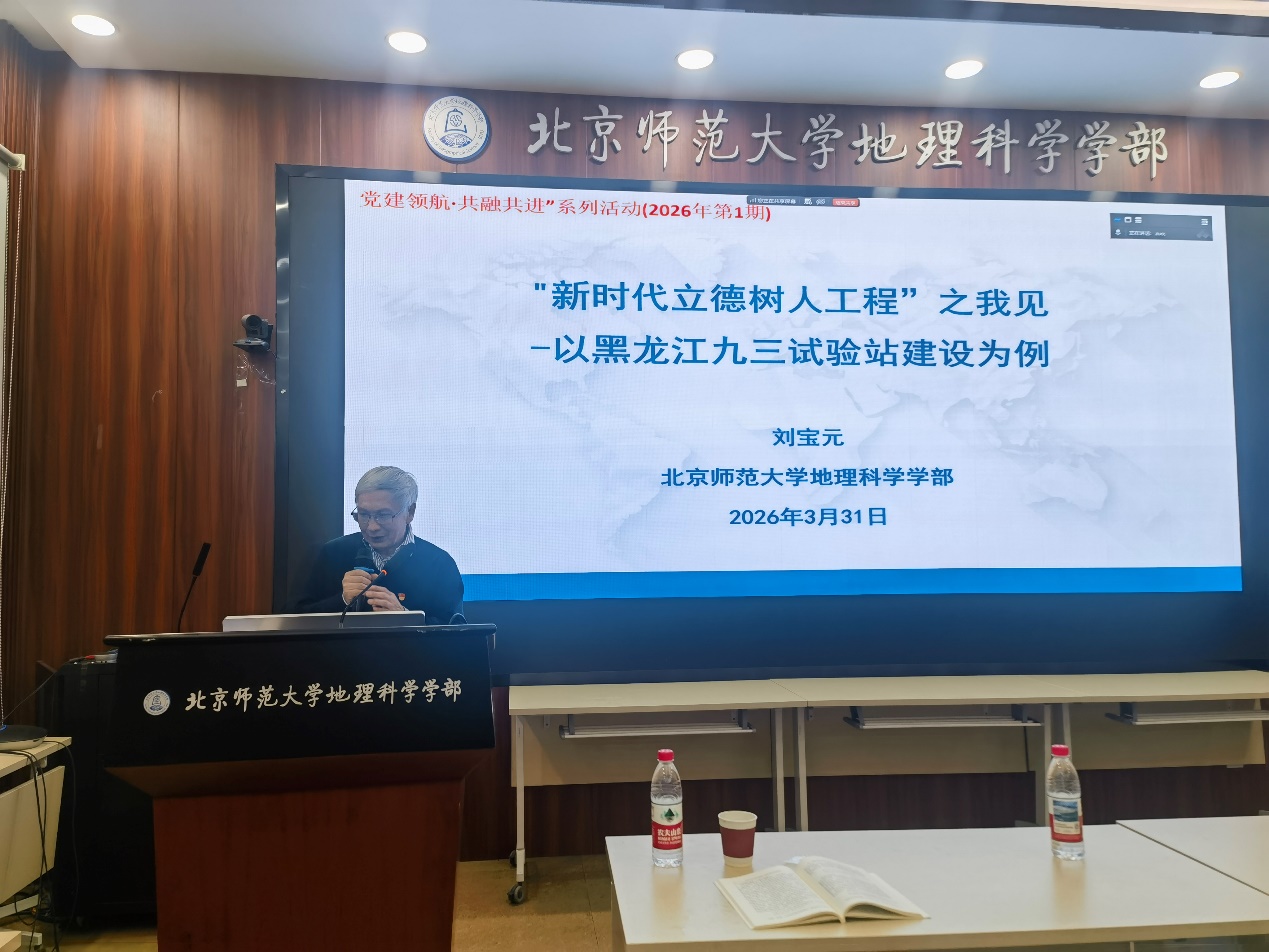 为深化教师交流、推动业务融合,落实立德树人根本任务,地理科学学部党委于2026年3月31日启动“党建领航·共融共进”系列活动。首期活动在生地楼180会议室举办,特邀学部刘宝元教授作题为“‘新时代立德树人工程’之我见——以黑龙江九三试验站建设为例”的专题讲座。学部党委副书记、副部长张红,副部长蒋卫国、工会主席杨华等出席活动,讲座由地理学院党支部书记潘成忠主持,学部师生代表到场聆听。