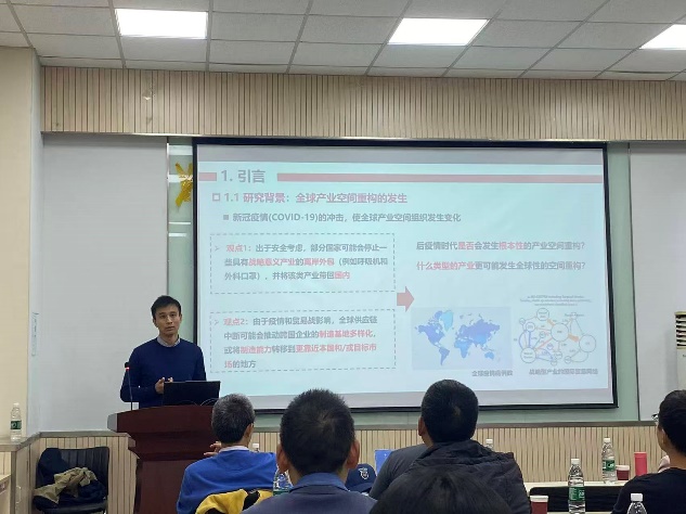 2025年11月6日下午,学术月首场报告在生地楼148会议室举行。北京大学城市与环境学院研究员、博雅青年学者朱晟君应邀作题为“超越全球化下的区域不均衡”的学术报告。报告由朱华晟教授主持,学院十余位教师及二十余名学生共同参与。朱晟君研究员从近五十年全球产业空间格局演变切入,借助“基因”等生动比喻阐释能力理论,进而从产品复杂度、地理粘性、高复杂产品相互依赖等维度,深入剖析区域不均衡与产业重构的内在机制。最后,他提出“战略性不相关多样化”发展路径,为后发地区的区域发展提供了新思路。