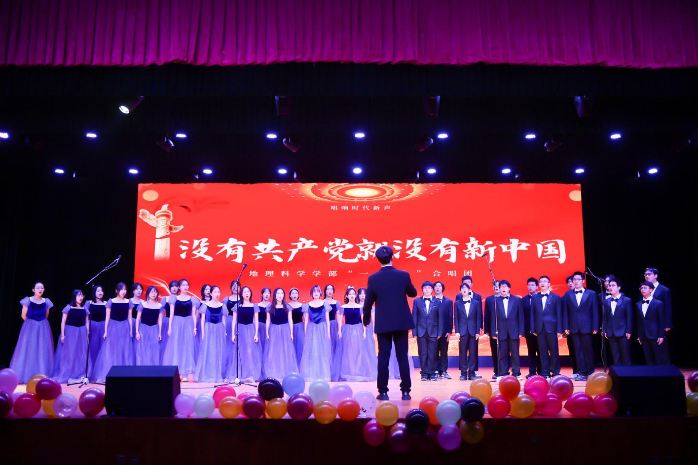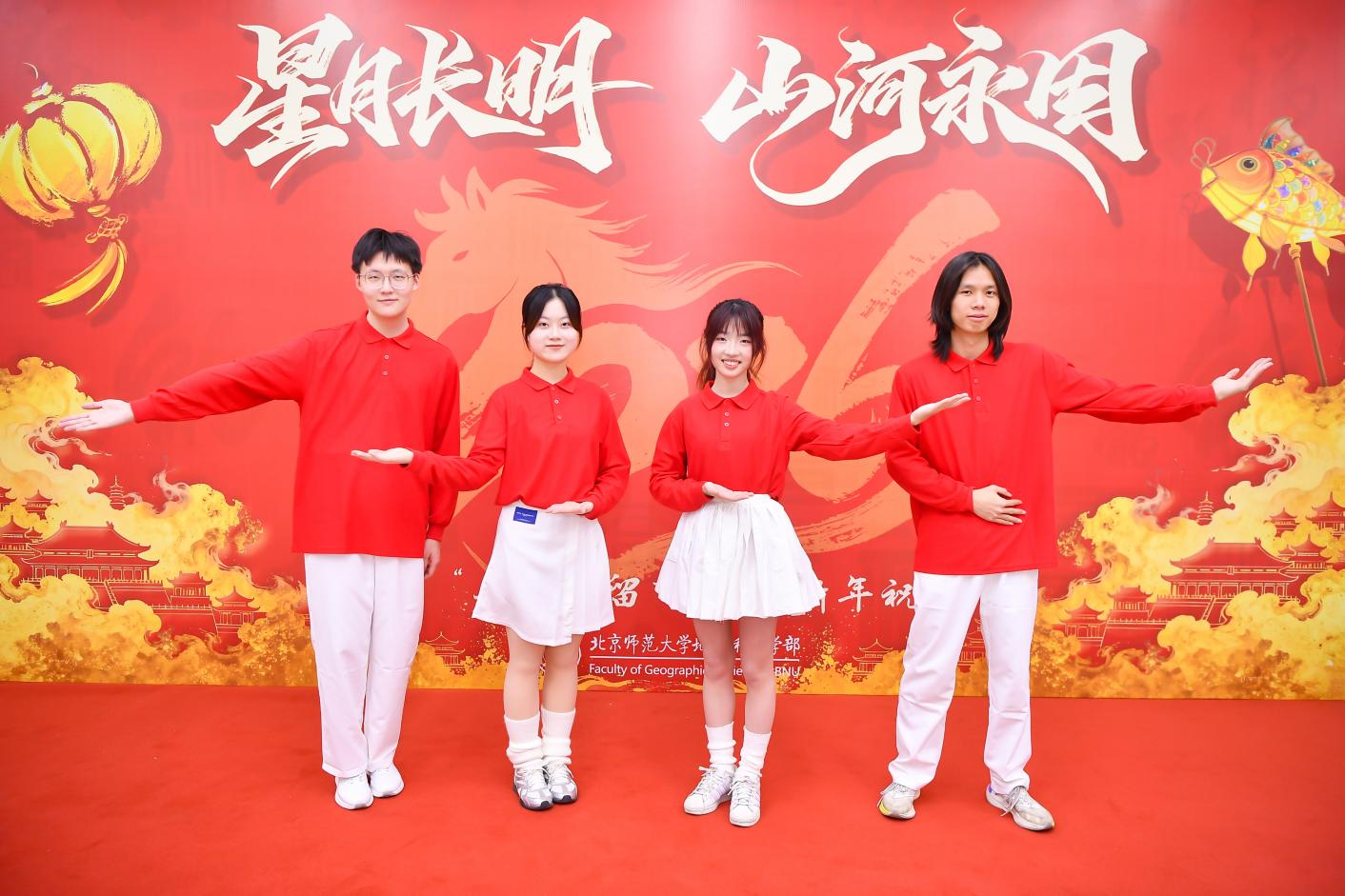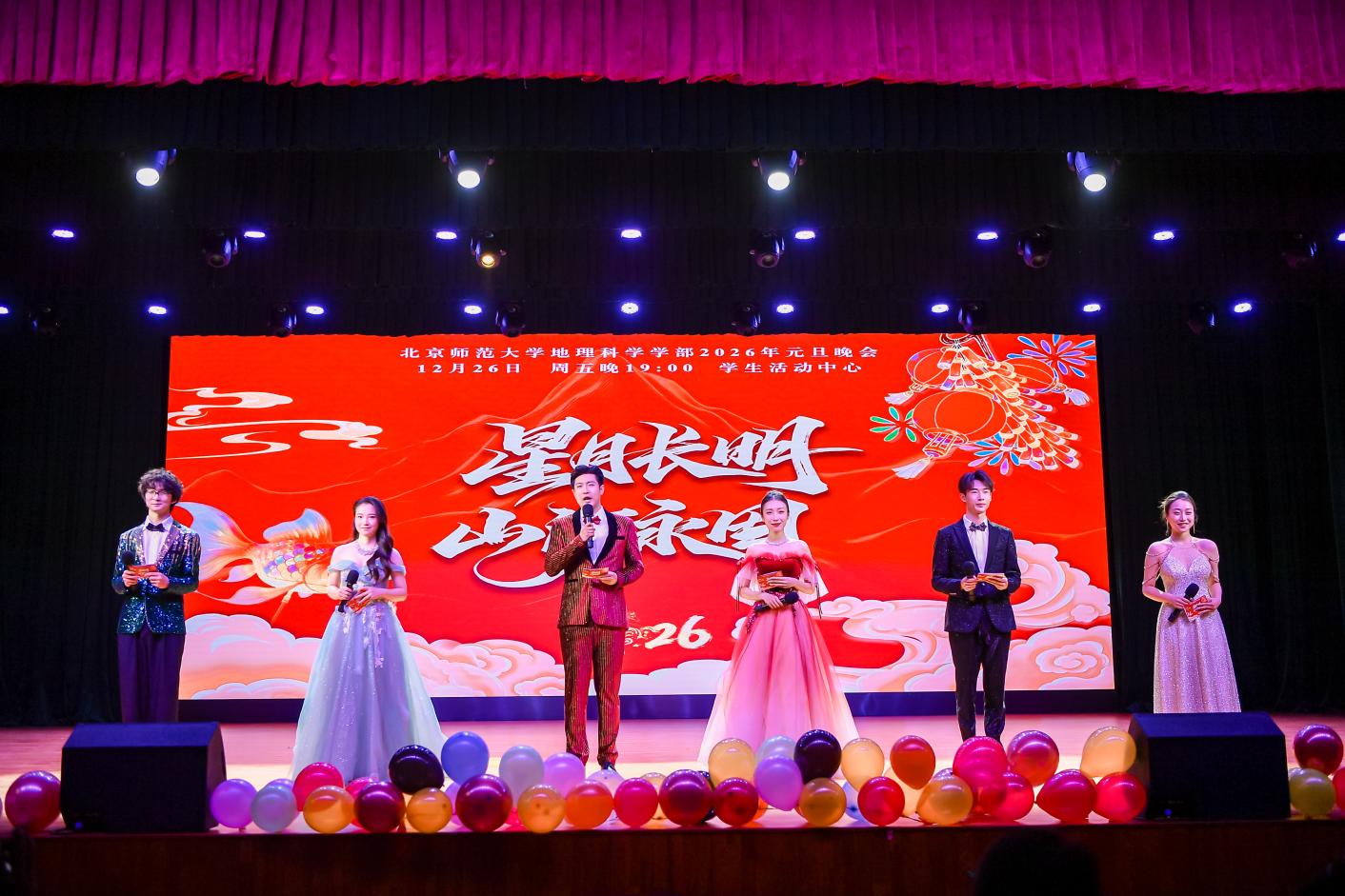 岁聿其莫,一元复始。2025年12月26日晚7点,地理科学学部2026年元旦晚会在学生活动中心举行。今年正值中国人民抗日战争暨世界反法西斯战争胜利80周年,晚会以“星月长明,山河永固”为主题,增添了历史厚重感与时代共鸣,红色歌曲传唱使整场演出不仅是一场文艺盛宴,更成为一堂生动而深刻的思政课。地理科学学部部长李小雁、党委书记徐洪及党政班子成员、学部多位老师出席活动。本次晚会由范雪松、刘美含、盛民民、赵涤非、吉承宇、耿一平六位同学主持。现场有近四百名观众,线上直播和图片直播总计近12万人次。