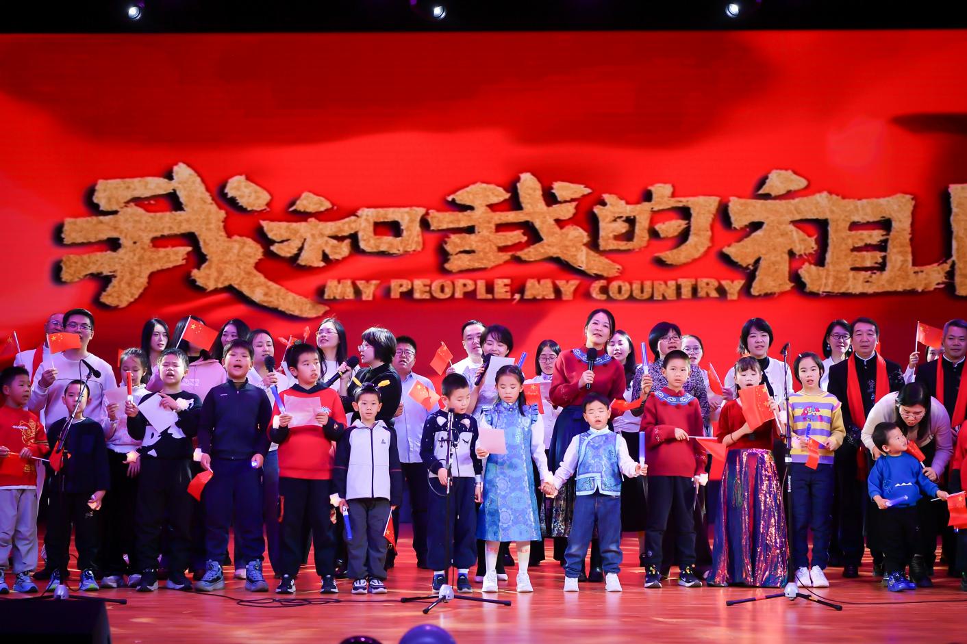 “会当凌绝顶,一览众山小”,第三篇章“山岳千秋”在磅礴气势中巍然展开。彼时的舞台化为层峦叠嶂的天地,光影勾勒出峻岭的轮廓,仿佛将千年山魂凝聚于此。舞蹈《罗敷行》以水袖轻扬再现汉唐气韵,每个凝眸都似从壁画中走出的诗篇;歌曲《红豆》在清越空灵的吟唱中,将古典情致与当代思念编织成月光般的声线;一二九合唱团带来的《没有共产党就没有新中国》以多声部交响编排,让经典旋律在时代回响中焕发磅礴新声;最后由学部领导教师与孩子们倾情演绎的串烧《山河岁月心》以深沉厚重的声音织就山河脉络,气氛再次被推向高潮。
