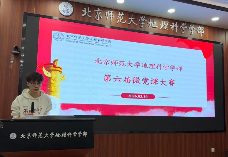 2026年3月10日上午8:30,地理科学学部第六届微党课大赛在生地楼180会议室举办。本次比赛以习近平新时代中国特色社会主义思想和党的二十大精神为指引,结合建党105周年重要节点,旨在进一步增强学生党员的理论学习质量与党性修养,引导学部广大学生党员立足地理学科特色,将党的创新理论、路线方针政策以形象生动、通俗易懂、贴近青年的方式鲜活呈现,激发理论学习热情,彰显青年党员的使命担当。
