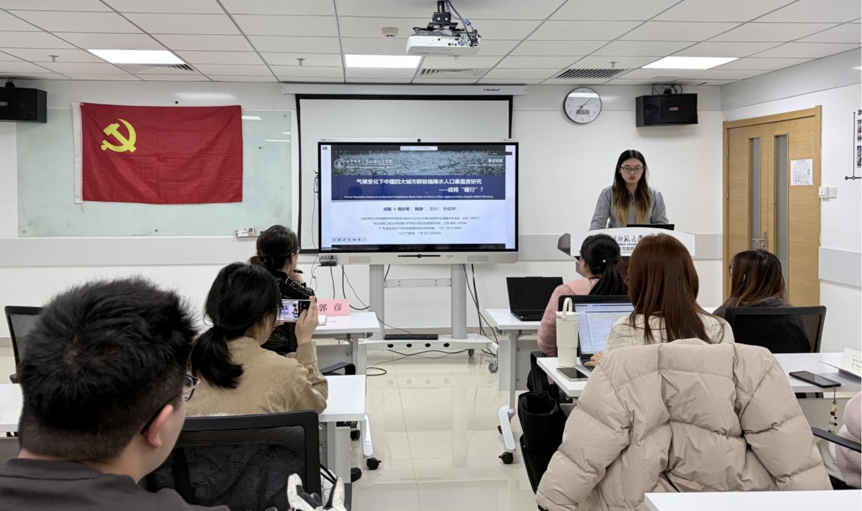 分享环节,第一位主讲人汤璐同学作了题为《气候变化下中国四大城市群极端降水人口暴露度研究——或将“缓行”?》的报告。研究聚焦1990—2020年期间,中国四大国家级城市群的极端降水及其人口暴露度时空变化特征如何?在21世纪,极端降水的变化和动态人口发展将如何共同影响四大城市群的人口暴露度?这两大科学问题,其研究结果对气候变化背景下的防灾减灾具有重要意义。