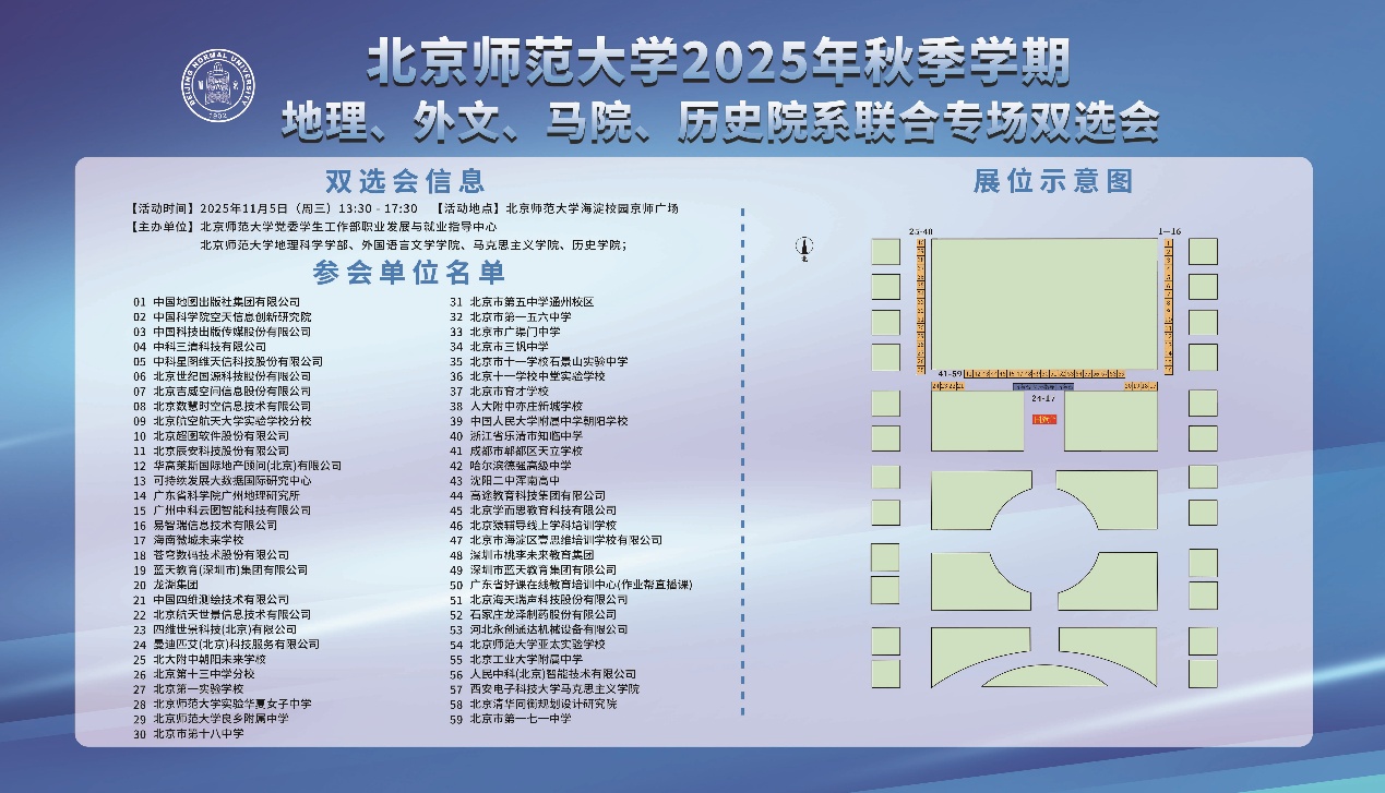 2025年11月5日下午13:30-17:30,由学校党委学生工作部职业发展就业指导中心指导,地理科学学部与三家兄弟院系联合主办的2025年专场招聘会在京师广场顺利举行。地理科学学部(学科)自2015年开始已经连续举办十届专场招聘会,主要服务于地理、遥感、生态、环境等相关学科应届毕业生。今年为进一步扩大服务覆盖面、整合院系资源,首次联合兄弟院系共同举办,除地理相关学科应届毕业生,同步面向全校各院系毕业生开放,为用人单位与求职学生搭建了更具广度与精准度的就业对接平台。