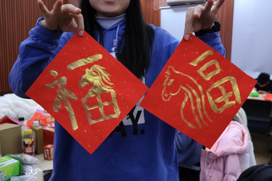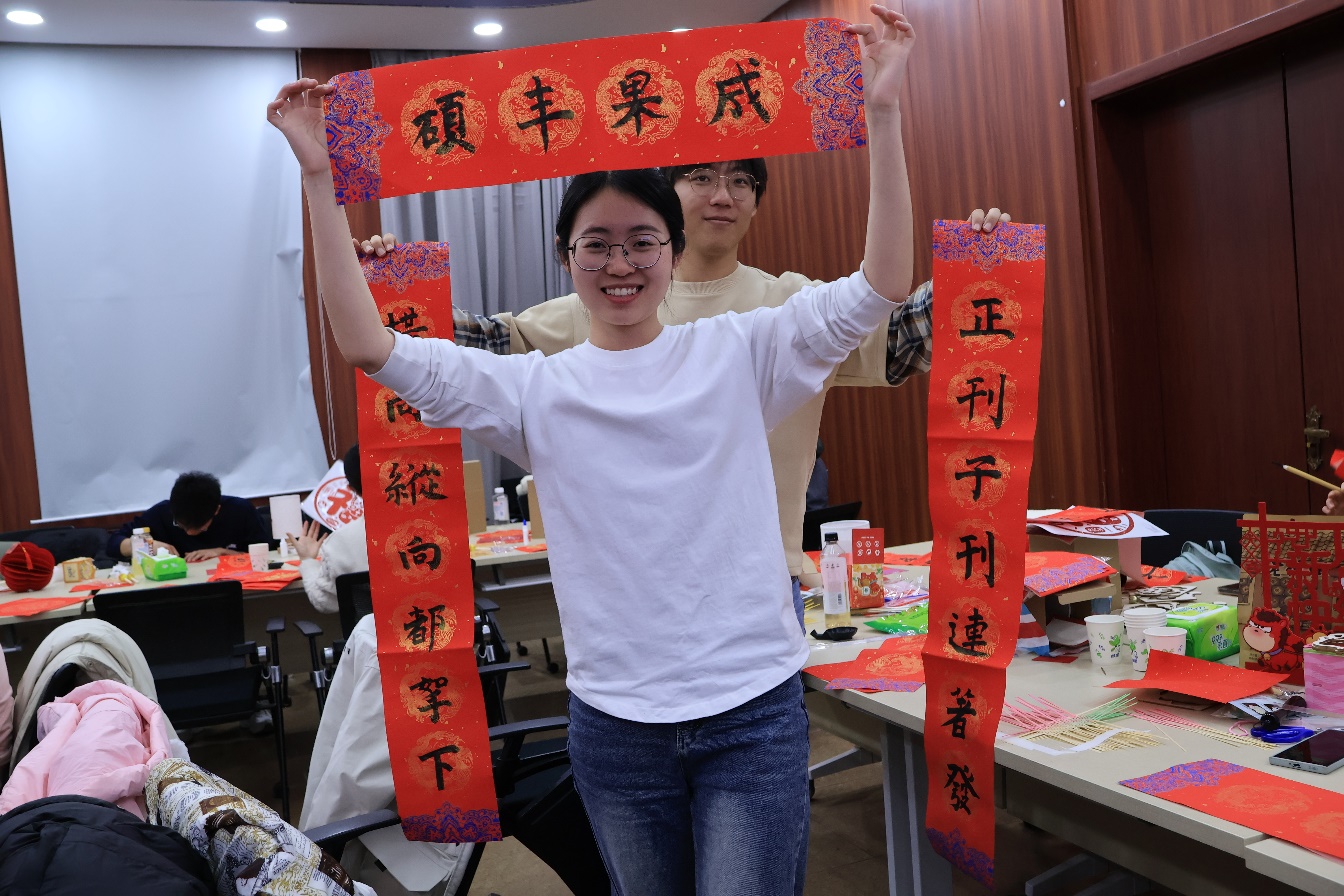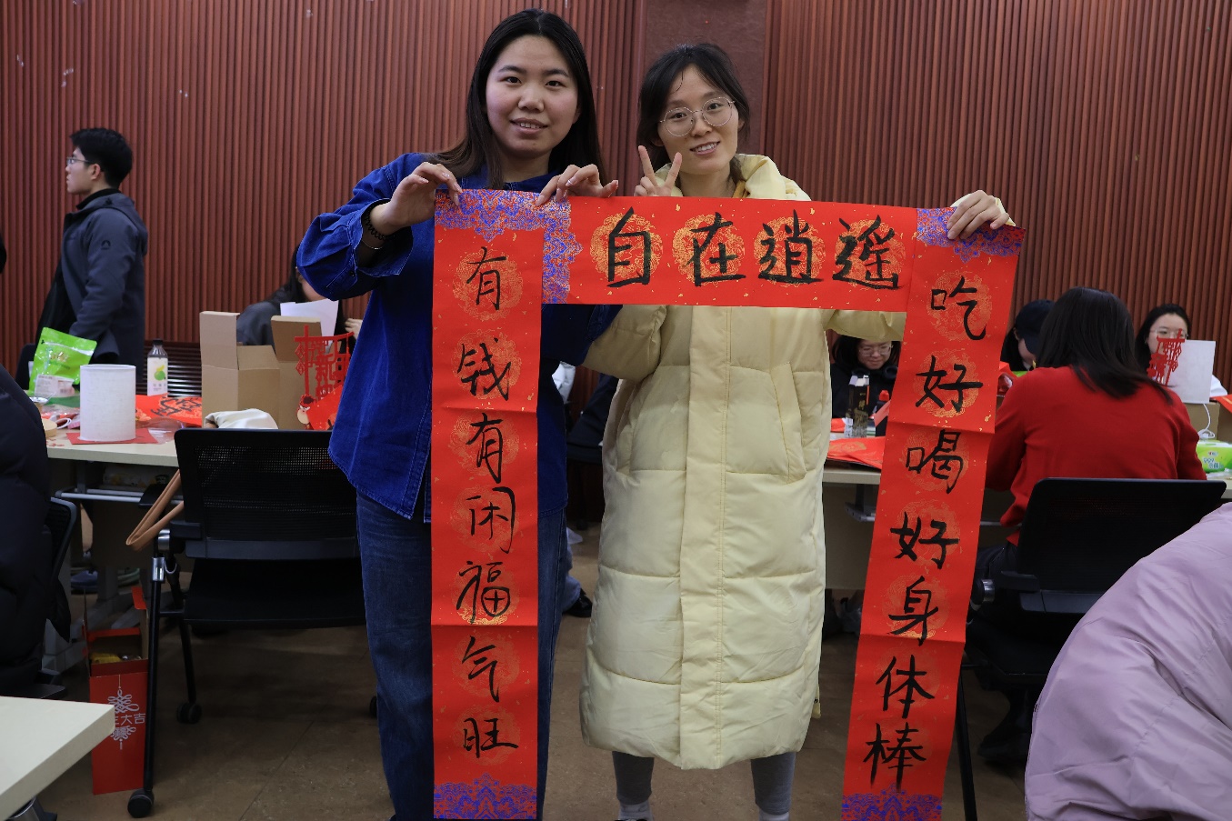 在“写对联、画福字”环节,墨香氤氲,笔走龙蛇。长桌铺陈,红纸舒展,师生们或凝神提笔、或相互交流,在一横一竖、一撇一捺之间写下对新年的祝愿。有人细细推敲词句,有人即兴挥毫创作,现场既庄重雅致,又充满欢声笑语。