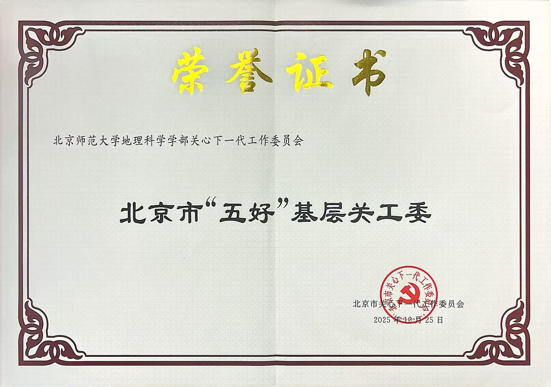 近日,北京教育系统关工委公布了2025年北京市“五好”基层关工委认定结果,北京师范大学地理科学学部关心下一代工作委员会成功获评,标志着学部关心下一代工作迈上新台阶。