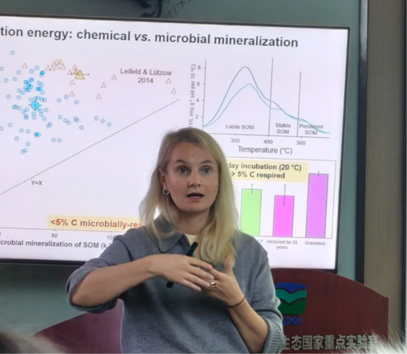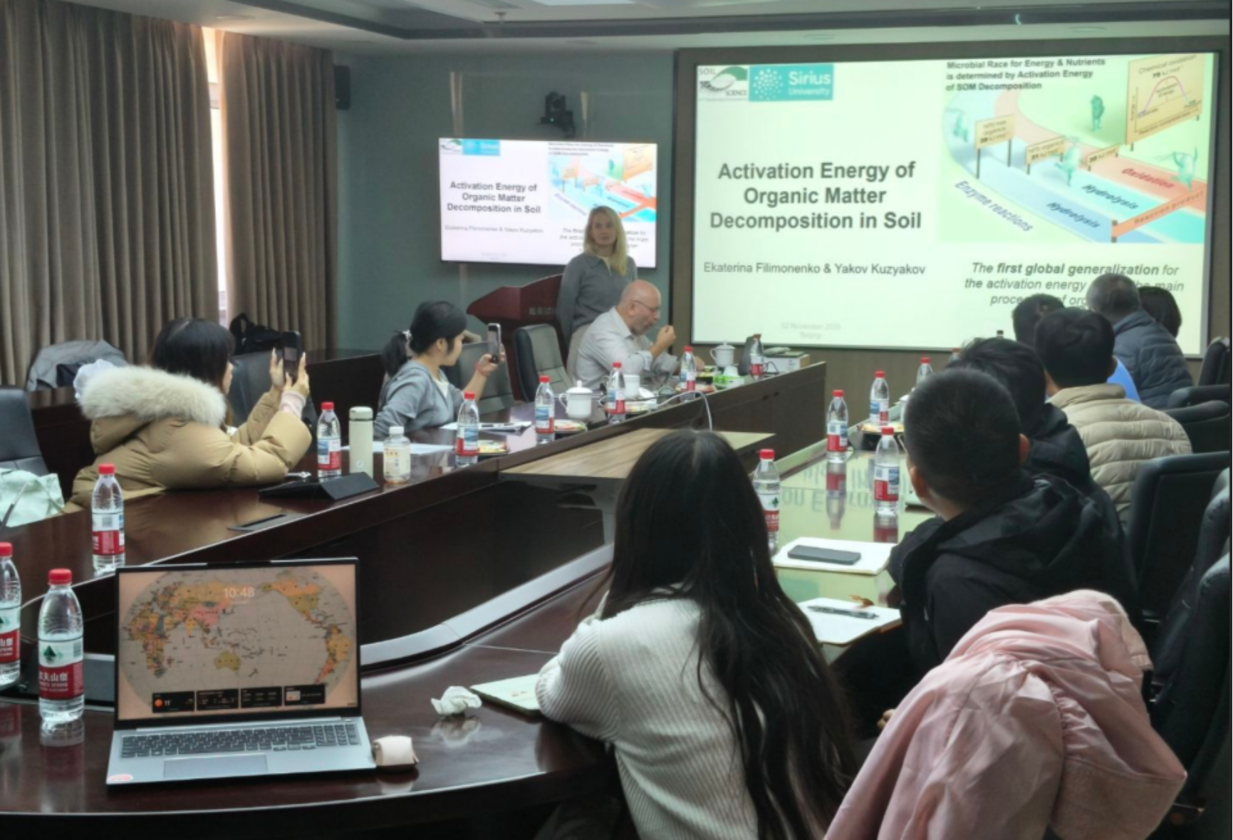 第二场报告中,Ekaterina A. Filimonenko副教授聚焦土壤有机质分解的活化能及其对全球变暖的响应。她首次系统量化了SOM转化过程中四种不同路径的活化能,揭示了全球变暖背景下碳与养分循环可能发生的解耦风险。该项研究整合了热分析、CO₂释放、微热量测定和酶活性四种方法,对比了化学氧化、微生物矿化、微生物分解及酶促反应等关键过程的活化能。数据显示,化学氧化活化能最高(79 kJ·mol⁻¹),而酶促反应能将活化能显著降低至33 kJ·mol⁻¹,使反应速率提升约140倍。特别值得关注的是,从含氮、磷和硫的有机物中裂解矿质离子的活化能比无营养元素的聚合物水解低9 kJ·mol⁻¹,这表明在全球变暖背景下,养分释放速度可能滞后于碳循环。这一发现预示随着全球变暖,高活化能的稳定SOM分解将加速,导致土壤碳库流失加剧,而养分释放速度相对迟缓,引发微生物可利用碳氮比升高,进一步限制生态系统生产力。Filimonenko副教授还指出,极端高温事件可能使非生物氧化成为SOM分解的主导途径,因为酶活性在超过50°C时会因变性失活。这项研究为理解土壤有机质稳定性提供了能量学新视角,对预测气候变化下的土壤碳循环反馈及农业管理具有重要科学价值。