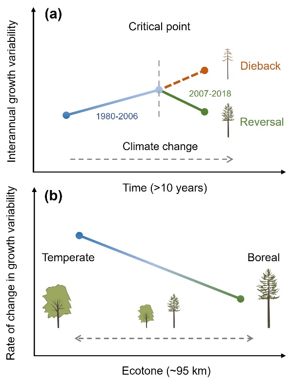在气候变化背景下,北方森林的生长模式发生了深刻变化。传统观点普遍担忧,持续变暖将促使北方森林生态系统发生不可逆的衰退,这一问题受到广泛关注。杜恩在教授团队基于野外样带调查与树木年轮学方法,解析了过去40年我国大兴安岭北方森林-温带森林交错区兴安落叶松径向生长年际变率的时间变化特征,发现气候变暖背景下北方森林南缘树木生长年际变率的增强趋势是可以逆转的(图1),证明北方森林具有强大的自我调节机制且尚未走向不可逆的衰退,相关结果近日以“Reversibility of interannual tree growth variability in southern boreal forest”为题发表在《Global Change Biology》期刊。