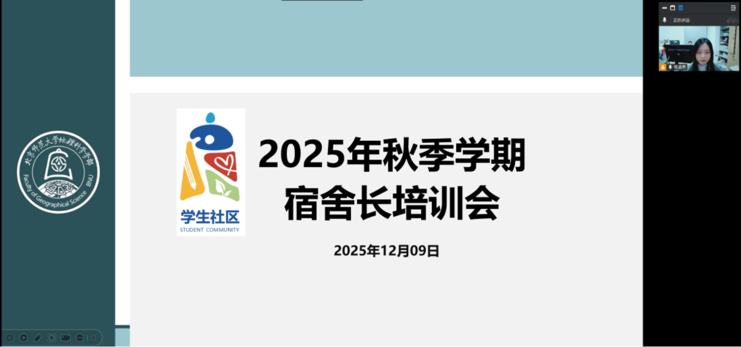 为进一步强化宿舍长责任担当,规范宿舍日常管理,丰富宿舍文化建设路径,营造安全和谐、积极向上的宿舍氛围,促进“一站式”学生社区高质量发展,12月9日晚7点,地理科学学部举办了2025年秋季学期宿舍长培训会。会议由胥孟希老师主持。