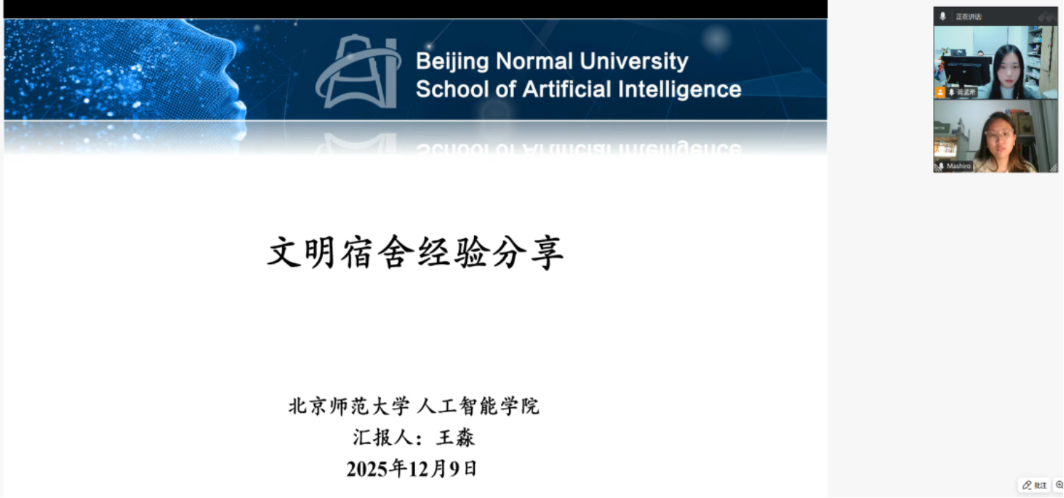 在经验分享环节,学部特别邀请了荣获“北京高校优秀学生基层组织”的宿舍舍长——人工智能学院的王淼同学和生命科学学院的文佳怡同学分别从不同角度分享了宿舍建设及评选文明宿舍的经验。她们结合自身宿舍管理经历,从共同兴趣培养、集体活动组织、包容互助氛围营造等方面,生动展现了优秀宿舍的建设历程,为与会宿舍长提供了可复制、可借鉴的宝贵经验,引发热烈共鸣。