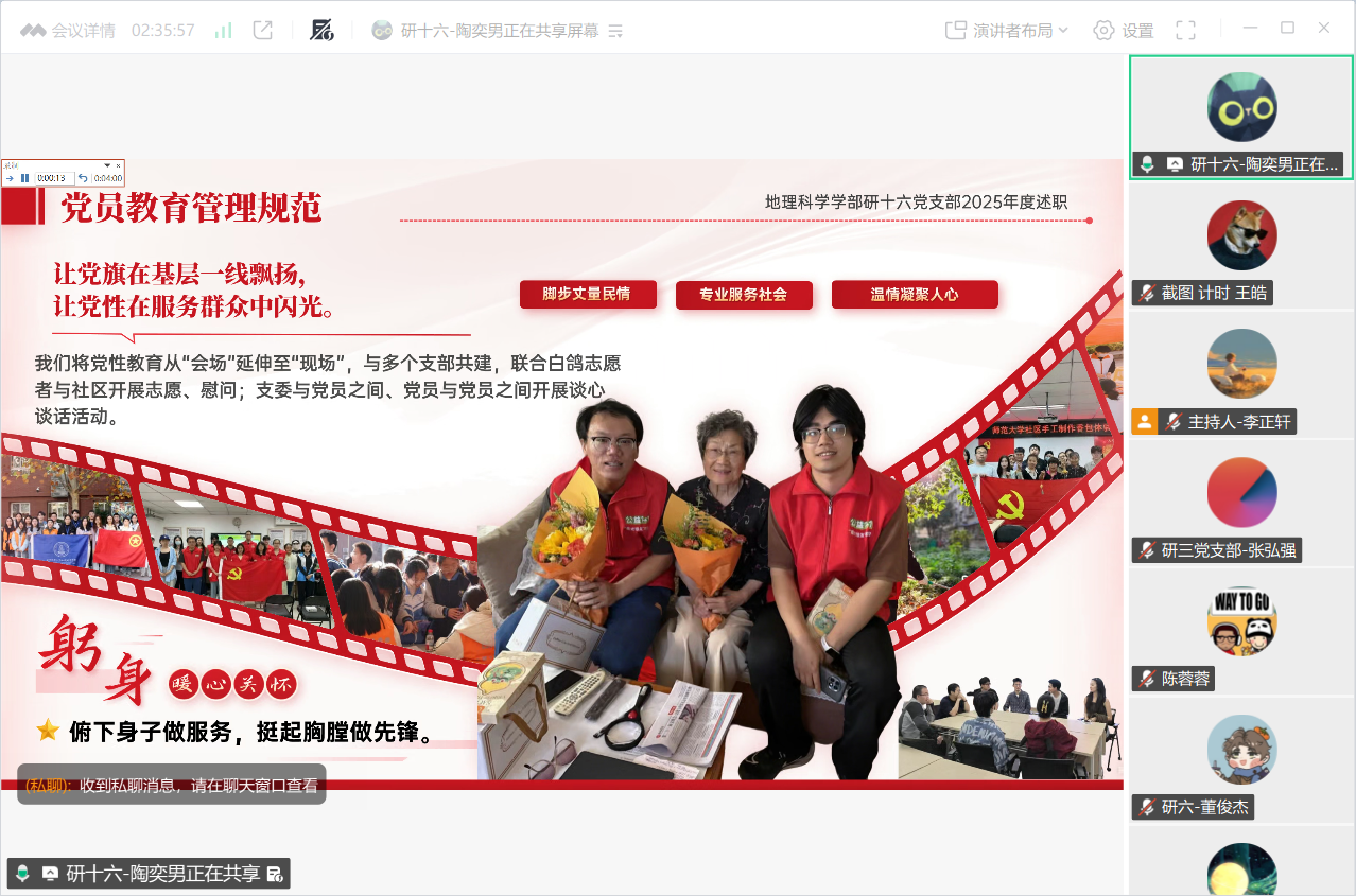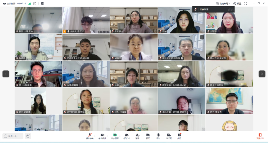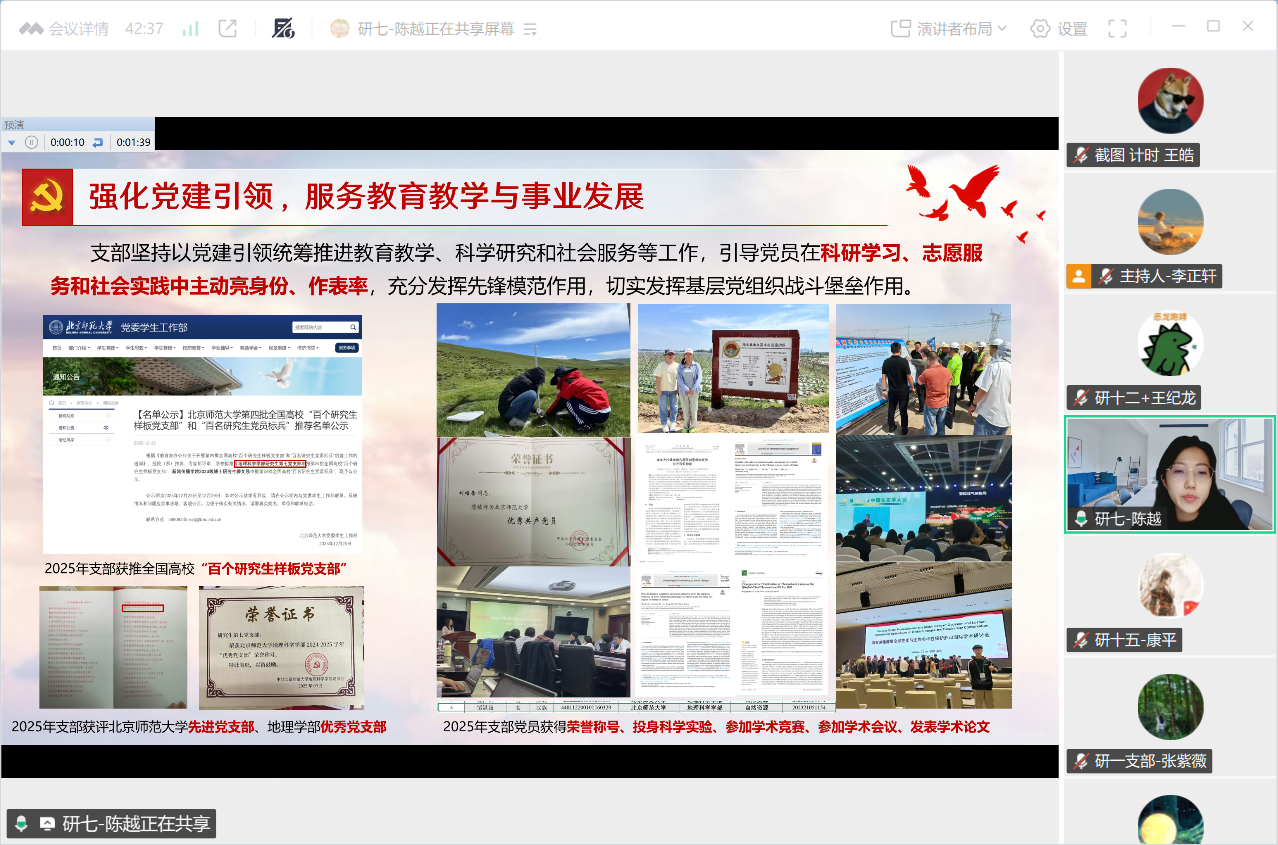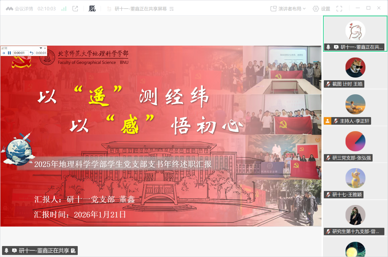 为深入贯彻学习习近平新时代中国特色社会主义思想,不断提升基层党支部党建质量,地理科学学部于2026年1月21日下午线上组织召开了2025年度学生党支部书记述职评议暨党支部工作总结会议。会议邀请了北京师范大学校级党建组织员、物理天文学院党委副书记刘珊珊列席指导,学部党委书记徐洪、副书记陈蓉蓉以及党团学工办公室石月婵、赵敏、王元慧担任教师评委,全体学生党支部书记及部分党建小组工作人员参与会议。