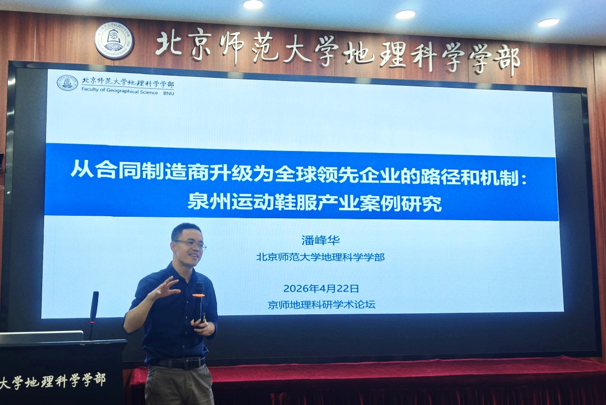 潘峰华教授作题为“从合同制造商升级为全球领先企业的路径和机制:泉州运动鞋服产业案例研究”的学术报告。他以泉州运动鞋服产业,特别是安踏集团为典型案例,通过长达数年的实地调研与访谈,将泉州企业的升级历程划分为代工生产、品牌驱动、上市融资、收购国际品牌四个阶段。在此基础上,他提出了一个整合区域制度、国内消费市场与全球资本市场三个维度的分析框架,揭示了泉州企业能够从合同制造商跃升为全球领先企业的系统机制。最后,潘教授分享了自身持续十余年聚焦金融地理、深耕案例研究的科研经验。